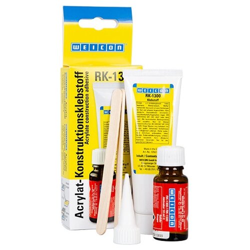 Конструкционный клей WEICON RK-1300 обладает высокой прочностью на разрыв, на расслаивание и ударопрочностью.Система состоит из клея и активатора, которые используются методом "no mix", что означает отсутствие необходимости смешивания обоих компонентов.Продукт особенно подходит для склеивания больших поверхностей из различных материалов, таких как металлы, ферриты и жесткие пластмассы. WEICON RK-1300 может быть использован в машиностроении и приборостроении, автомобилестроении, производстве инструментов и пресс-форм, строительной и мебельной промышленности и во многих других отраслях промышленности.Технические характеристики:Основа - МетилметакрилатЦвет после затвердевания - бежевый, матовыйУдельная плотность смеси - 1,2 g/cm^3Вязкость смеси - 21.000 mPa·sСтруктура - пастообразныйРучная прочность (35% прочности) - после 6 мин.Ручная прочность (50% твердость) - после 9 мин.Температура обработки - от +10 до +40 °CОкончательное отверждение (100% прочность) - после 24 чЗаполнение зазоров - 0,4 - 0,8 ммСреднее значение прочности на сдвиг согласно DIN 1465 на:Алюминий - 20 N/mm^2Сталь, подвергнутая пескоструйной обработке - 25 N/mm^2Нержавеющая сталь - 25 N/mm^2ПК (поликарбонат) - 10 N/mm^2Полиметилметакрилат - 9 N/mm^2АБС - 6 N/mm^2Твердый поливинилхлорид - 7 N/mm^2Композиционный материал на стекловолокнистой основе - 16 N/mm^2Углепластики - 24 N/mm^2Полиамид 6.6 - 2 N/mm^2Устойчивость к температурам - от -50 до +130 кратковременно до +180 °C