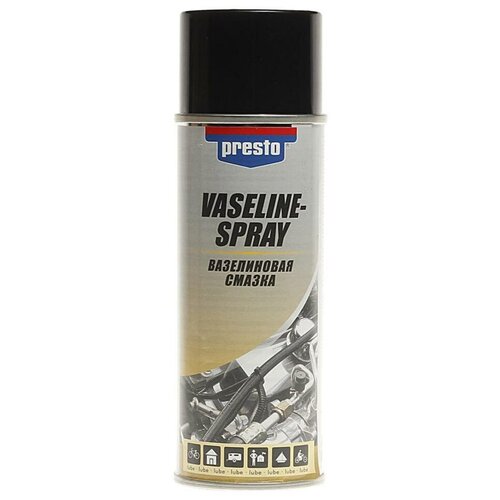 Вазелиновая бескислотная смазка PRESTO 0,2л 225093 используется при сборке и монтаже. Эффективно предотвращает образование коррозии на разъемах и винтовых соединениях, инструментах, аккумуляторных батареях, замках и других механизмах автомобиля. Обладает изоляционными свойствами. Диапазон рабочей температуры от -30°С до +180°С. Устойчива к воздействию погодных условий, слабых кислот и щелочей. Состав легко наносится благодаря баллончику с распылителем.