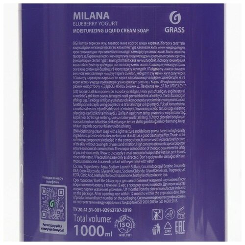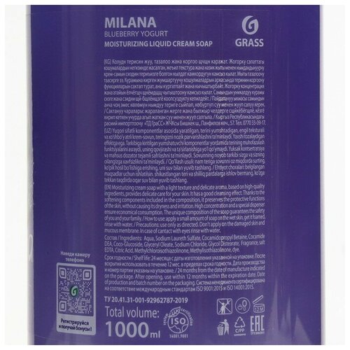 Жидкое крем-мыло Milana черника в йогурте с дозатором 1л Grass / 00000000767070