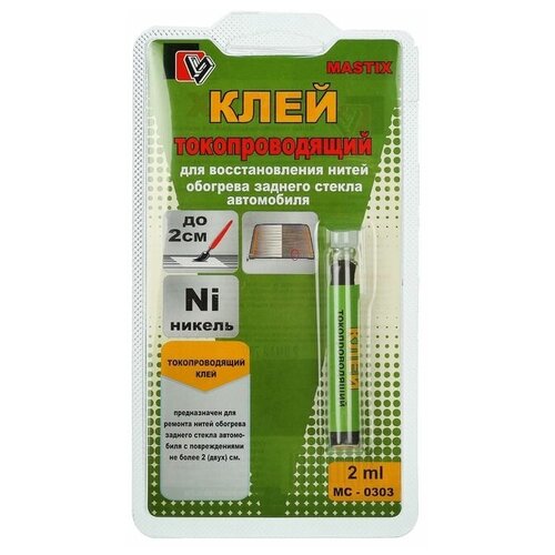 Токопроводящий клей на никелевой основе предназначен для ремонта нитей обогрева заднего стекла автомобиля с разрывами до 2 сантиметров. Инструкция по применениюТщательно взболтайте содержимое флакона. Отделите самоклеящуюся часть трафарета от подложки и разместите на стекле так, чтобы место разрыва было посередине прорези. С помощью кисти нанесите на стекло через трафарет слой клея сразу после перемешивания. Через минуту нанесите второй слой. Примерно через час, после высыхания клеевого шва, удалите трафарет. При температуре воздуха не ниже 20 °C восстановленная система обогрева будет готова к работе примерно через 2 часа. Одним тюбиком клея вы отремонтируете до 20 сантиметров повреждённых нитей.