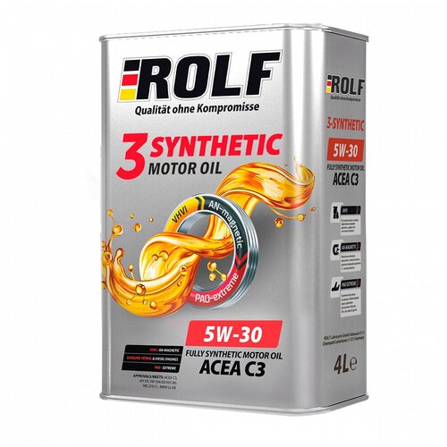 ROLF 3-SYNTHETIC SAE 5W-30 С3 - полностью синтетическое моторное масло, предназначенное для максимальной защиты современных высокофорсированных бензиновых и дизельных двигателей легковой техники, работающей в различных условиях эксплуатации. Полностью совместимо со всеми системами снижения токсичности выхлопных газов: DPF, TWC, EGR, SCR. Обеспечивает превосходную защиту от износа, особенно в термонагруженных зонах, улучшенную термоокислительную стабильность для предотвращения накопления отложений и образования лаков на поверхностях деталей двигателя. Обеспечивает надёжную и максимально эффективную работу современных высокотехнологичных двигателей, созданных по новейшим инженерным разработкам.Применение3-SYNTHETIC 5W-30 C3 предназначено для применения в современных бензиновых и дизельных двигателях, включая турбированные с непосредственным впрыском, широкого парка автомобилей, в том числе оборудованных системами снижения токсичности выхлопа DPF, TWC, EGR, SCR Рекомендовано для применения в двигателях автомобилей Daimler AG, BMW AG, Volkswagen AG предъявляющих дополнительные требования к моторным маслам, согласно указанным спецификациям . Ключевые особенности• Непревзойденная защита от шлама.• Защита системы снижения токсичности выхлопов, поддержание в чистоте сажевых фильтров.• Превосходная защита от износа продлевает срок службы двигателя и его узлов.• Обеспечивает отличные пусковые качества и высокую надежность смазывания холодного двигателя.• Уникальная термическая и антиокислительная стабильность масла гарантирует защиту двигателя на весь срок службы масла.• Отличная термическая и окислительная стойкость при температурах свыше 100 °С обеспечивает защиту поршней от образования нагара.Допуски:MB 229.51ACEA C3-16API SNVW 504.00/507.00Porsche C30BMW Longlife-04MB-Approval MB 229.31, 229.51PORSCHE C30