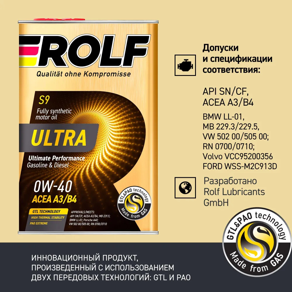 Описание Полностью синтетическое моторное масло«Rolf Ultra SAE 0W-40 ACEA A3/B4 API SN/CF» произведено из высококачественных синтетических базовых масел (GTL + PAO) и многофункционального пакета присадок, гарантирует легкий запуск двигателя при низких температурах, превосходную защиту двигателя от износа, препятствует образованию отложений, обеспечивая его максимальную мощность и производительность в любых условиях эксплуатации. Допуски и соответствия API SN; АCEA A3/B4; MB 229.3/229.5; BMW LL-01; PORSCHE A40; VW 502 00/505 00; RN 0700/0710; PSA B71 2296 Ключевые особенности • Поддерживает максимальную производительность двигателя, защищая его от отложений и износа. • Легкий старт двигателя при экстремально низких температурах с первой секунды. • Высокий индекс вязкости обеспечивает оптимальную работу масла в разных температурных режимах. • Масло сохраняет свои свойства в разных условиях эксплуатации, обеспечивая максимально эффективную работу двигателя. • До 40% меньше потерь от испарения в сравнении с маслом стандарта ACEA A3/B4*, что позволяет экономить на доливке масла.*По данным оценки испаряемости масла по методу ASTM D5800 NOACK volatility test Применение Предназначено для применения в современных бензиновых и дизельных двигателях легковых автомобилей, в том числе с турбонаддувом и непосредственным впрыском топлива, где производителем рекомендуется уровень свойств ACEA A3/B4 или API SN/CF и ниже. Использование только оригинальных пакетов присадок крупнейших мировых компаний обеспечивает полное соответствие указанным допускам автопроизводителей.