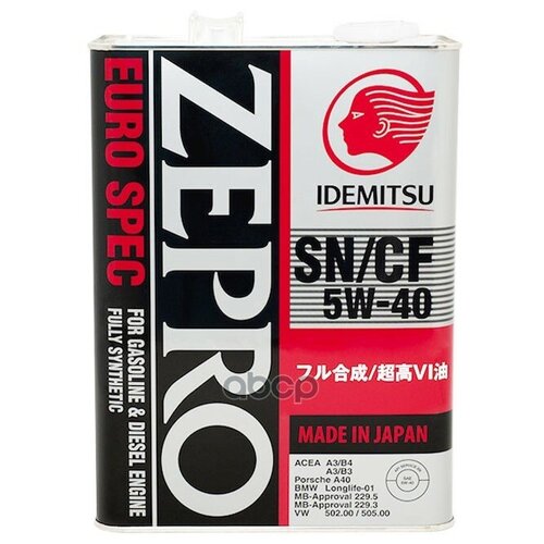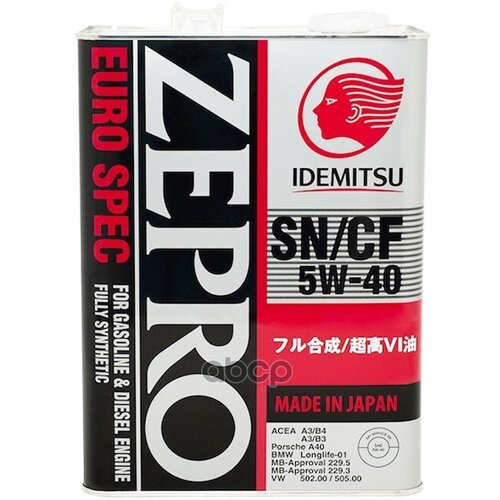 IDEMITSU Масло Моторное Zepro Euro Spec 5W40 4L Sn/Cf, Acea A3/B4, Mb 229.5, Vw 502.00/505.00, Bmw Ll-01, Por