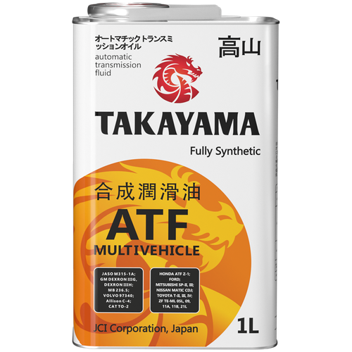 Синтетическая высокоэффективная универсальная жидкость для автоматических трансмиссий.Идеально подходит для применения в современных автомобилях японского, европейского и американского производства.Обеспечивает повышенный ресурс и удлиненный интервал замены жидкости в автоматических трансмиссиях.Препятствует пенообразованию.Благодаря высокому индексу вязкости, гарантирует плавное переключение передач даже при низких температурах.Жидкости ATF ТАKАYАМА успешно заменяют оригинальные трансмиссионные масла и полностью соответствуют даже самым жестким стандартам и требованиям гигантов автопрома, таких как: Toyota, Nissan, Ноndа, Ford, Mitsubishi и др.ATF MULТIVEHICLE имеет спецификации: Mitsubishi SPIII, Toyota IV, Honda ATF Z1.