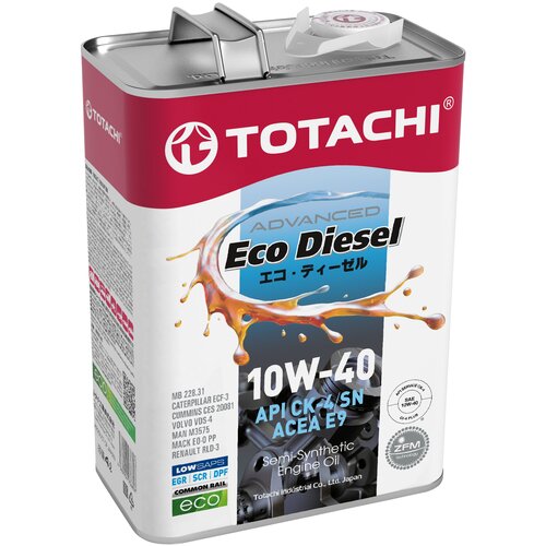 TOTACHI Eco Diesel 10W-40 – премиальное полусинтетическое моторное масло для дизельных двигателей. Обеспечивает максимальную эффективность диспергирования сажи и превосходную защиту от износа двигателей магистральной и внедорожной техники, также другой техники, требующей моторного масла с категориями 10W40 API CI-4. Продукт отвечает строгим требованиям большинства производителей современных и более ранних двигателей грузовиков, автобусов, строительной, сельскохозяйственной и горнодобывающей техники, генераторов, двигателей рыболовных судов а также другой техники, оснащенной системами рециркуляции выхлопных газов (EGR) и системами SCR NOx. Способствует увеличению срока службы двигателя и его отдельных частей. Используется с дизельным топливом с содержанием серы до 0,05% массы. Идеально подходит для смешанных парков техники, где присутствуют двигатели различных марок.