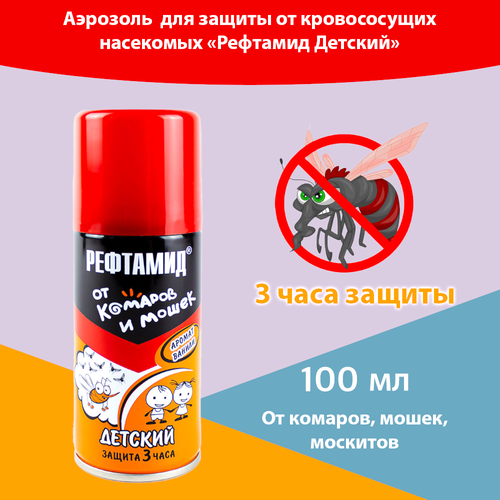 Репеллент Рефтамид Детский - средство для защиты детей от укусов кровососущих насекомых (комаров, мокрецов, москитов). Состав разработан с учётом особенностей чувствительной детской кожи. Детям с трёхлетнего возраста средство наносится на одежду, с пятилетнего возраста на открытые части тела. Сохраняет своё действие в течение 2 часов. Обладает ароматом сочных ягод.