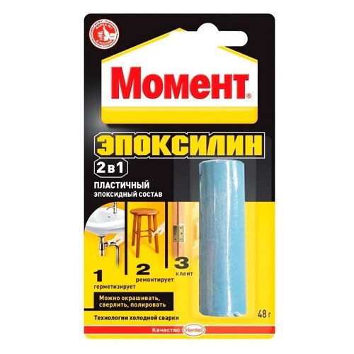 Артикул № 855019 Двухкомпонентный эпоксидный состав 2-в-1 на основе эпоксидных смол. Применяется для склеивания, герметизации, ремонта и восстановления изделий из различных материалов: всех видов металла, дерева, керамики, стекла, стекловолокна, пластиков, кирпича, плитки, мрамора, цемента и других материалов. Момент Эпоксилин идеален для восстановления недостающих частей, для заполнения вмятин, сколов, трещин, подходит для реставрации всех видов строительных материалов, в том числе природных и искусственных камней и бетона. После отверждения клеевой шов можно полировать, сверлить, красить.