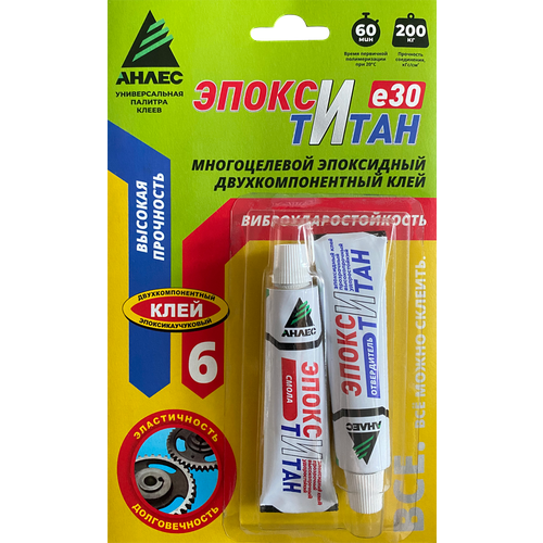Эпокси-титан Равнокомпонентный, ударопрочный, эластичный, повышенной прочностиОбласть применения:Надежное склеивание однородных и разнородных материалов (металлов, пластмасс, дерева, стекла, керамики, фарфора, бетона).Соединение деталей, подверженных вибрации и ударным нагрузкамЗаполнение трещин, раковин, отверстий, пор с регулируемой эластичностьюРегулируемая эластичность