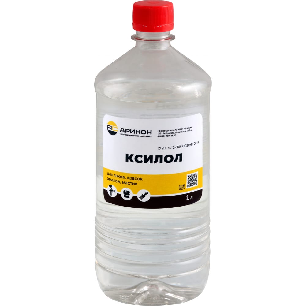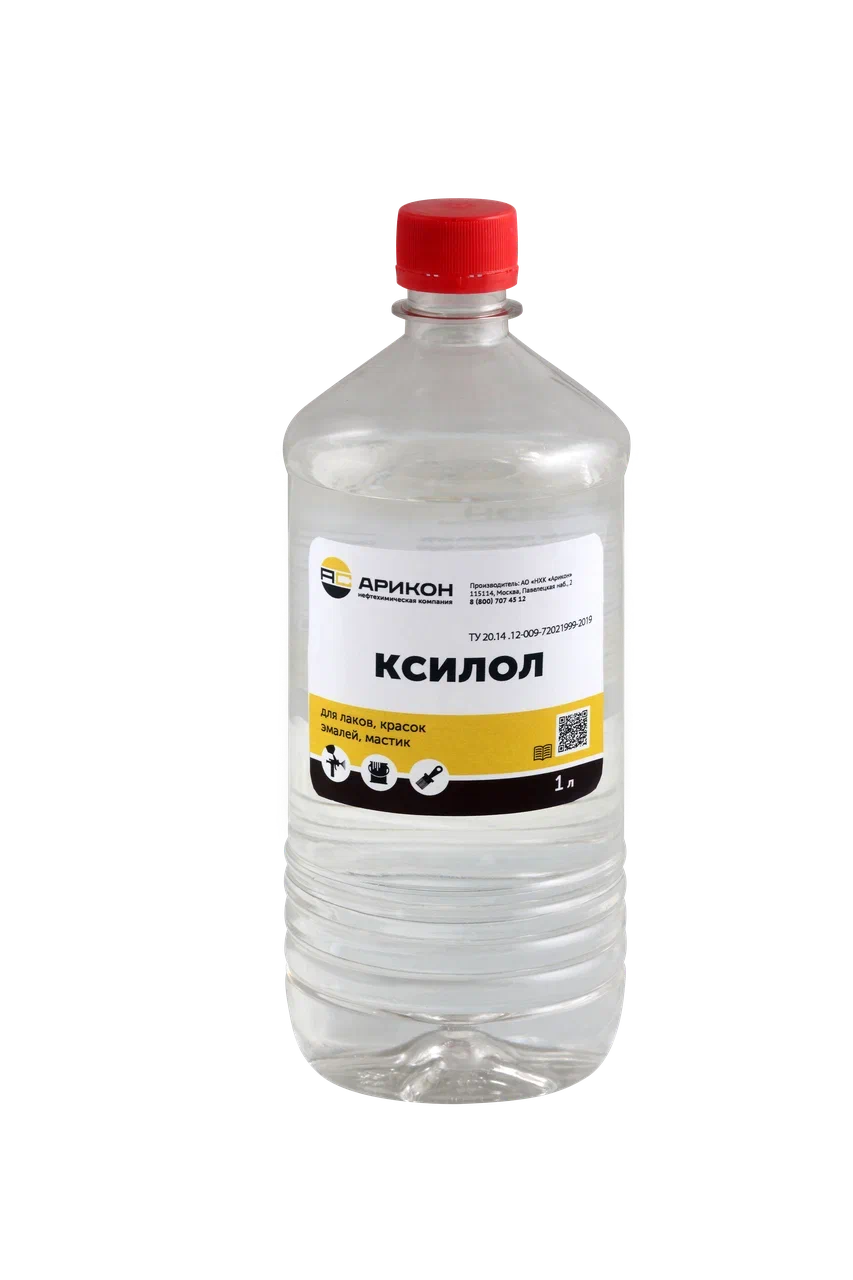 Ксилол Арикон по ТУ 20.14.12-009-72021999-2019. Предназначен для растворения лаков, красок эмалей, мастик, шпатлёвок и грунтовок на основе алкидной смолы (1:1), эпоксидной, виниловой, акриловой смолы (согласно инструкции производителя ЛКМ). Поставляется в пластиковом флаконе емкостью 1 литр.