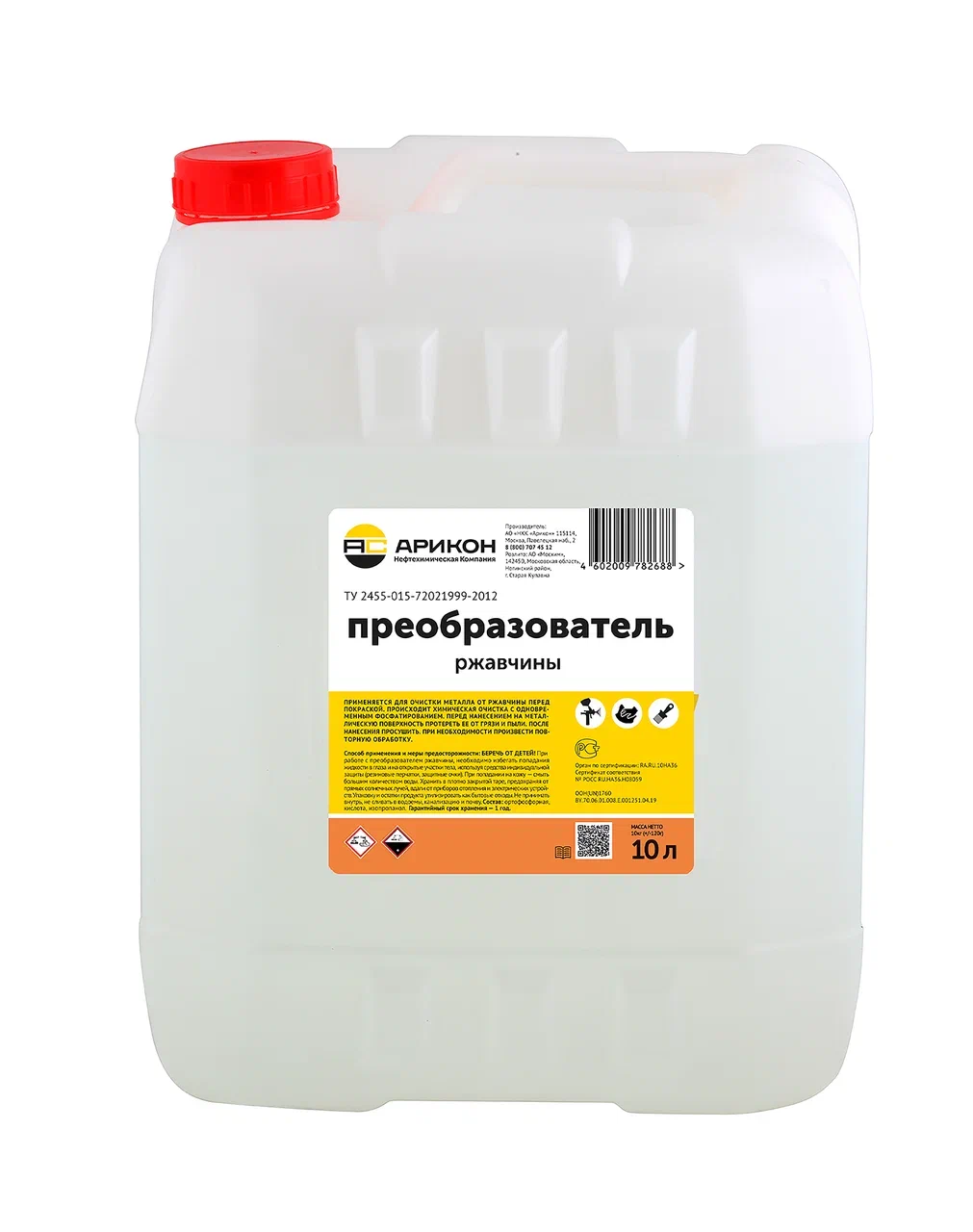 Преобразователь ржавчины арикон 10 л 00-00001509 - высококонцентрированный раствор, позволяющий удалять или модифицировать ржавчину или окалину практически любой толщины. Также консервирует металлические изделия на срок до 1 года для условий У-1. Используется перед окрашиванием металлических поверхностей.