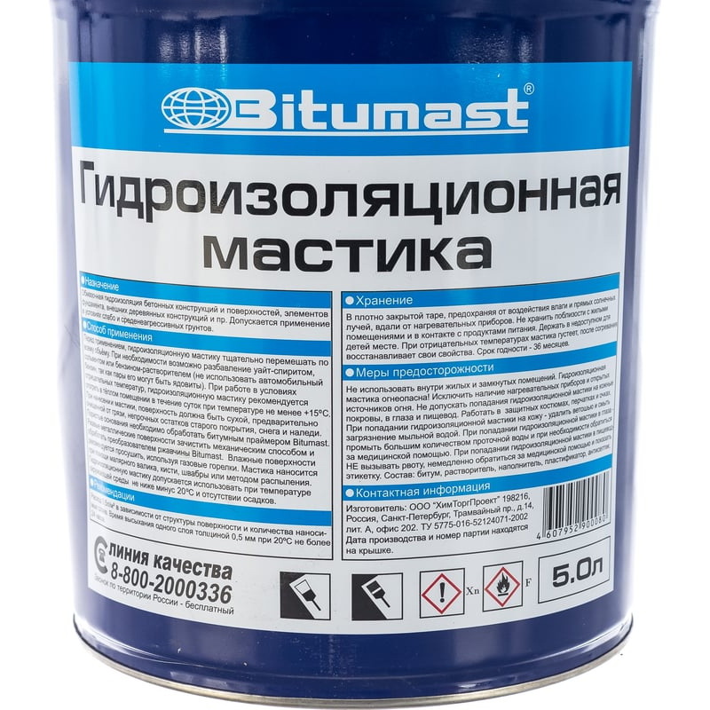 Битумная мастика Bitumast - это состав на основе нефтяного битума с добавлением профессиональных технических примесей и растворителя.ПреимуществаМастика готова к применению.В составе присутствует антисептическая добавка.Наносится кистью, валиком либо методом безвоздушного распыления.Время высыхания одного слоя составляет не более суток при температуре +20 градусов Цельсия.Область примененияПрименяется для обмазочной гидроизоляции поверхностей из дерева и бетона: стен, подвалов, элементов кровли, фундамента и перекрытий. Возможно использование при низких температурах от -20 градусов Цельсия, при этом мастику необходимо предварительно отогреть.Бренд Bitumast принадлежит производственной компании "ХимТоргПроект" и выпускает холодные битумно-полимерные мастики, горячие мастики, клеи. В производстве используется высококачественное сырье и применяются уникальные технологии, учитывающие особенности условий эксплуатации.
