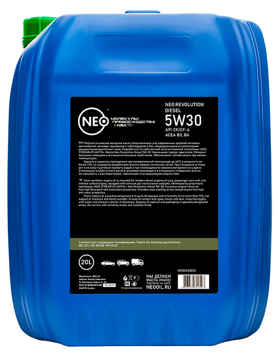 Специализированное, полнозольное, стойкое к механической деструкции, с высокими эксплуатационными свойствами синтетическое моторное масло, разработанное для высокофорсированных дизельных двигателей с непосредственным (и промежуточным) впрыском топлива легковых автомобилей и фургонов европейского производства (BMW, Mercedes-Benz, VW), отвечающих требованиям норм Евро II, Евро III. Применяется для автомобилей, не оснащенных сажевыми фильтрами – DPF.Разработанное по собственной запатентованной технологии «NEO STREAM ATLANTIC», моторное масло Neo Revolution diesel 5W-30 обладает рядом исключительных свойств:• Увеличивает ресурс двигателя;• Обладает высокой стабильностью вязкости;• Обладает повышенной смазывающей способностью;• Обеспечивает легкий запуск в условиях низких температур;• Имеет высочайшие противоизносные и противоокислительные свойстваНеужели это самое БЕЗОПАСНОЕ масло на рынке России?Масло NEO - это Ваш лучший выбор, потому что:1. Максимально охлаждает двигатель, обеспечивая приятную прохладу Вашему силовому агрегату даже в моменты максимальных нагрузок.2. Идеально очищает двигатель, бережно собирая в себе все отложения, которые образуются при ежедневной езде на авто.3. Безупречный контроль качества. Другими словами NEO наиболее безопасное масло для двигателя, поскольку его невозможно подделать, так как купить его можно только в авторизованных точках продаж от завода.