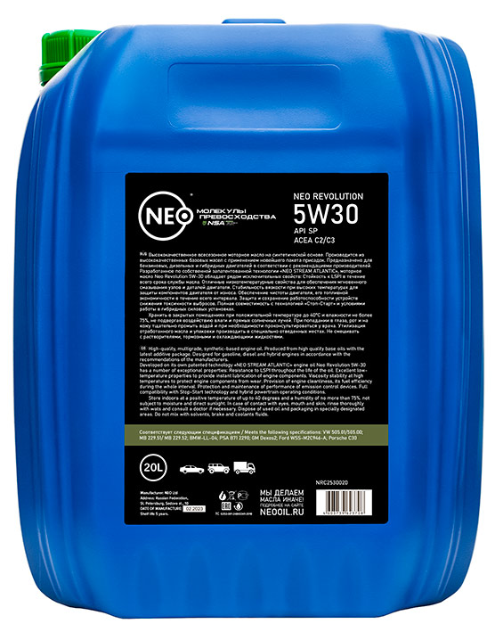 Синтетическое всесезонное моторное масло класса «Low SAPS». Произведено из высококачественных базовых масел с применением новейшего пакета присадок и модификаторов вязкости. Предназначено для бензиновых, дизельных и гибридных двигателей в соответствии с приведенными ниже спецификациями автопроизводителей для автомобилей, оснащенных системами понижения токсичности отработанных газов (DPF/GPF, TWC).Разработанное по собственной запатентованной технологии «NEO STREAM ATLANTIC», моторное масло Neo Revolution 5W-30 обладает рядом исключительных свойств: Стойкость к LSPI в течение всего срока службы маслаОтличные низкотемпературные свойства для обеспечения мгновенного смазывания узлов и деталей двигателя;Стабильность вязкости при высоких температурах для защиты компонентов двигателя от износа;Обеспечение чистоты двигателя, его топливной экономичности в течение всего интервалаЗащита и сохранение работоспособности устройств снижения токсичности выбросов;Полная совместимость с технологией «Стоп-Старт» и условиями работы в гибридных силовых установках. Купить моторное масло NEO - означает прибрести для своего автомобиля, защиту, долговечность и безопасность.