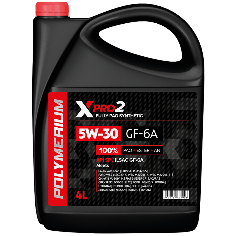 Всесезонное полностью синтетическое масло POLYMERIUM XPRO2 созданное из лучших базовых ПАО и эстеровых масел, с добавлением мощного пакета присадок. Соответствует классу API SP и ILSAC GF-6А. XPRO2 - масла топового уровня, превосходящие аналоги по техническим характеристикам, составу и цене. Полностью PAO база + 15-20% эстеров в составе. Улучшенные противоизносные свойства, добавление органического MOdtc. Превосходные низкотемпературные показатели (не замерзает до - 65 градусов) и лучшая стойкость к угару/испарению, за счет базовых PAO масел. Подходит для автомобилей Honda, Mazda, Subaru, Toyota с бензиновыми двигателями, и другими с классом допуска GF-6A.API SP | ILSAC GF-6A | Ford WSS-M2C929-A, WSS-M2C946-A, WSS-M2C946-B1 | GM Dexos1 Gen2, 4718 M, 6094 M | FIAT 9.55535-CR1 | Chrysler MS-6395 | ACURA | CHRYSLER | DODGE | FIAT | FORD | GENESIS | HONDA | HYUNDAI | INFINITI | KIA | LEXUS | MAZDA | NISSAN | MITSUBISHI | SUBARU | TOYOTA
