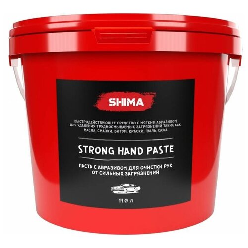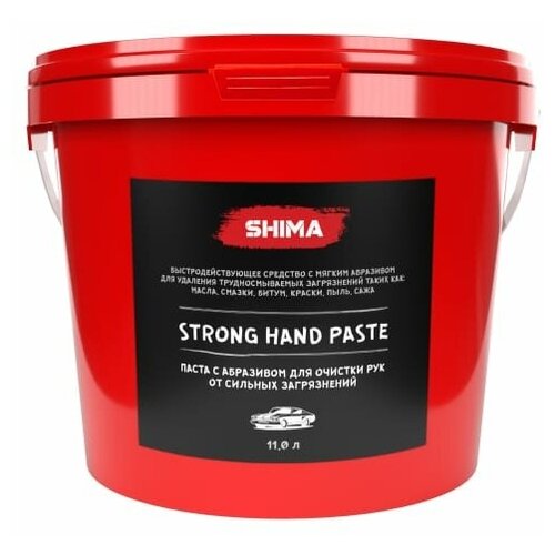 Паста для очистки рук 11 л SHIMA DETAILER "STRONG HAND PASTE". Очищает руки от таких загрязнений, как: масло, смазка, битум, антикоррозийные материалы и другие загрязнения, 1шт(Артикул 000057-1)Описание: Паста предназначена для ежедневного применения и бережной очистки рук от таких загрязнений, как: масло, смазка, битум, антикоррозийные материалы и другие загрязнения. Идеально подходит для очистки рук автолюбителей после ремонтных работ. Благодаря содержанию скраба и мягких поверхностно-активных веществ, паста позволяет очищать трудносмываемые загрязнения, но в то же время за счет содержания увлажняющих компонентов не вызывает сухости и растрескивания кожи.Способ применения:На загрязненные руки нанести небольшое количество пасты, тщательно растереть, смыть водой.Меры предосторожности:Не использовать для других целей.При попадании в глаза срочно промыть большим количеством воды.При необходимости обратиться к врачу.Беречь от детей.После использования или истечения срока годности пластиковую тару утилизировать как бытовой отход.После вскрытия упаковки использовать в течение 6 месяцев.Хранить в закрытом виде отдельно от пищевых отходов при температуре от +5*С до +25*С.Срок годности 36 месяцев с даты изготовления.