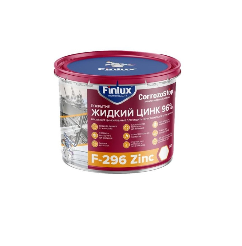 Инновационное цинконаполненное покрытие (96%) для долговечной антикоррозионной защиты методом «холодного цинкования» металлических конструкций в промышленном и гражданском строительстве, сельском хозяйстве, на объектах ТЭК, в дорожном и транспортном строительстве, гидросооружениях с абсолютной защитой на срок до 50 лет во всех типах коррозионной активности без исключений: включая агрессивные и сильноагрессивные среды. Финлюкс КоррозоСтоп Ф-296 Цинк 96% - обладает стойкостью даже к морской и пресной воде! Высокое содержание высококачественного цинкового порошка (96%), многократно замедляет процесс коррозии и защищает окрашенные поверхности на срок до 50-ти лет. А главное метод «холодного цинкования», применяется для защиты надводных частей кораблей! Защита с помощью Finlux F-296 Zinc серии CorrozoStop — это лучшая альтернатива горячего цинкования и Ваша выгода до 20%, в сравнении с покраской обычными красками.