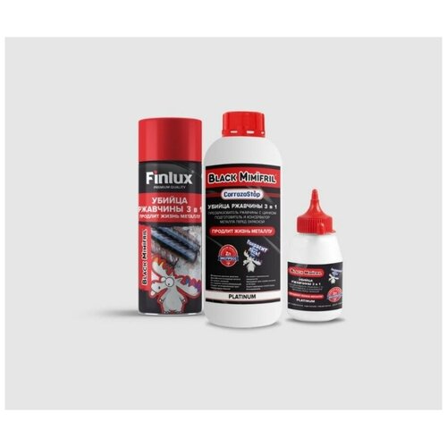 Finlux CorroZoStop Black Mimifril– высокоэффективный инновационный комплекс образует на обрабатываемой поверхности грунт-пленку черного цвета, которая препятствует проникновению влаги, кислорода и воздуха к металлам, тем самым, исключая повторное развитие коррозионных процессов. Активная формула убийцы, наносит Тройной удар по ржавчине: u Удаляет ржавчину и плотно сцепленную прокатную окалину- преобразовывая ее в крепко держащуюся на поверхности цинко-хромированную пленку; u Образует прочное полимерное покрытие темного цвета - которое является отличным защитным грунтом перед последующим окрашиванием и увеличивает срок службы финишного лакокрасочного покрытия; u Дезактивирует образование коррозии - формируя пассивирующее защитное покрытие для консервации и хранения металла на долгий срок (под навесом) Уникальный преобразователь с цинком, является отличной альтернативой трудоемкому процессу механической очистки корродированных поверхностей и позволяет с лазерной точность производить чистку любых металлов любого рельефа для реставрации и восстановления или снятия ржавчины с оборудования и их элементов, оконных решеток, автозапчастей, инструментов, под покраску и полировку не повреждая обрабатываемую поверхность. Как только Вы нанесете «Убийцу» на металл, преобразователь практически моментально начнет «выедать» ржавчину и плотно сцепленную прокатную окалину и преобразовывать ее в крепко держащуюся на поверхности цинко-хромированную пленку черного цвета. Защищает поверхности от повторного ржавления при межоперационном хранении на открытом воздухе под навесом, при влажности воздуха не более 90%. Покрытие "CorrozoStop" созданное преобразователем ржавчины Black Mimifrill, обладает высокой стойкостью к влаге и надежно защищает металлическую поверхность от дальнейшей коррозии, в том числе и в бетоне, предотвращая его разрушение. Преобразователь БЛЭК МИМИФРИЛ можно заливать водой, что делает его привлекательным вариантом при использовании в бытовых целях.