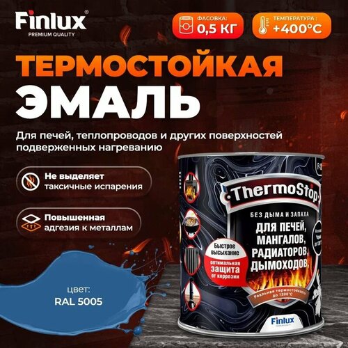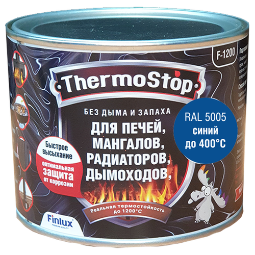 Краска, Грунт-Эмаль Finlux F-1200 до +1200°C Антикоррозионная, Быстросохнущая, Кремнийорганическая, Матовое покрытие, ral 5005, 0,5 кг., 400 С