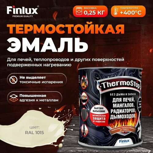 Грунт эмаль краска по ржавчине для металла матовая Finlux F-1200 до +1200C антикоррозионная, для печей, мангалов, дымоходов, радиаторов, суппортов, глушителей , ral 1015, 0,25 кг, 400 С