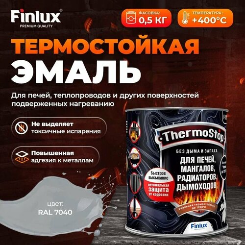 Краска, Грунт-Эмаль Finlux F-1200 до +1200C Антикоррозионная, для печей, мангалов, дымоходов, радиаторов, суппортов, глушителей Гладкая, Быстросохнущая, Матовое покрытие, ral 7040, 0,5 кг, 400 С