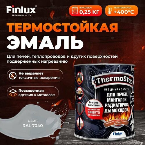 Грунт-Эмаль Finlux F-1200 до +1200C Антикоррозионная, для печей, мангалов дымоходов радиаторов Гладкая, Быстросохнущая, Кремнийорганическая, Матовое покрытие, ral 7040, 0.25 кг, 400 С