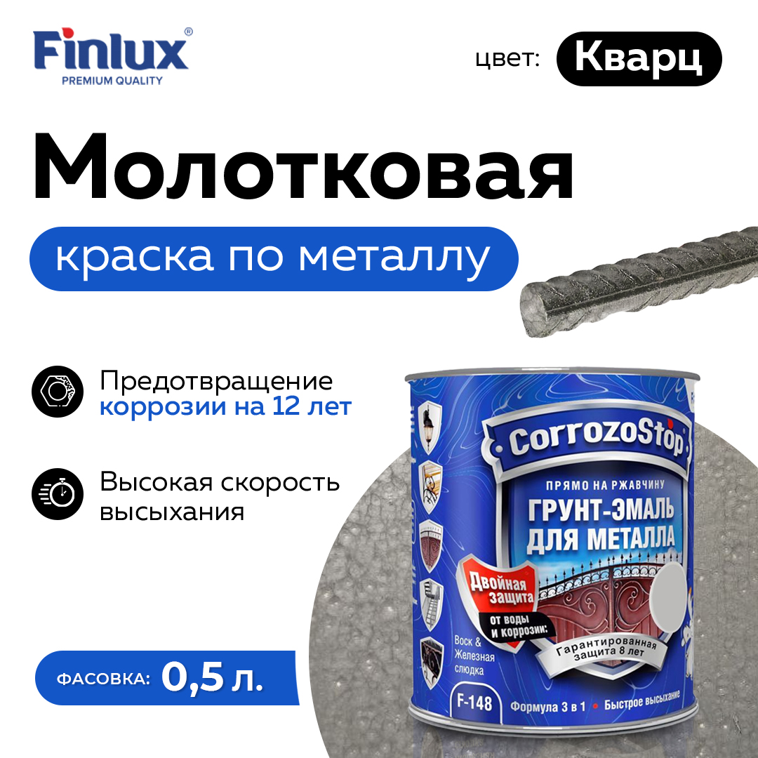 • Прямо на ржавчину.• Защита поверхности до 8 лет.• Образует атмосферостойкое покрытие с грязе- и водоотталкивающими свойствами.• Эластичное покрытие, не растрескивается.• Молотковая краска по металлу обладает отличной укрывистостью и адгезией к ржавой поверхности.Краска 3 в 1 по ржавчине с уникальной формулой. Грунт — выравнивает поверхность. Защита от коррозии — останавливает ржавчину. Финишное покрытие чешуйчатой структуры — блокирует путь воде, не допуская ни капли ее до металла. Содержит активные антикоррозийные добавки (фосфат цинка). Благодаря запатентованным современным технологиям краска для металла по ржавчине Finlux F-148 обеспечивает двойную защиту металлической поверхности от воды и коррозии до 8 лет. Краска по ржавчине для металла образует износостойкое и эластичное покрытие, которое остается устойчивым и не растрескивается при перепадах влажности и температуры внутри и снаружи помещений. Finlux F-148 обладает чешуйчатой структурой, служащей дополнительным барьером на пути кислорода и воды к металлической поверхности. Содержит силиконовые добавки, которые создают усиленный барьер для влаги и грязи. Покрытие устойчиво к воздействию бытовых химикатов и кратковременному воздействию моторного топлива и масел. Быстро высыхает на поверхности благодаря особым компонентам, входящим в состав краски. Время до нанесения второго слоя составляет около 4–6 часов, поэтому вся работа может быть завершена за один день. Легко наносится без разбрызгивания и потеков, является тиксотропной краской. Обеспечивает экономичный расход — одним литром можно окрасить до 10 м² подготовленной поверхности.Finlux — покрасит даже Лось!