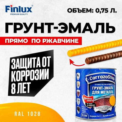 Универсальная грунт-эмаль 3в1 по металлу и ржавчине Finlux F-148, глянцевая, ral 1028, 0,75 л