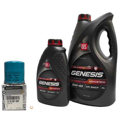 Оригинальный набор для технического обслуживания автомобилей Renault Kaptur , Duster, Logan, Sandero, Arkana с двигателем 1,6 H4M.В состав набора входит все, что необходимо для замены масла на вашем Renault:Оригинальный набор для технического обслуживания автомобилей Renault Logan, Sandero 1,6 K4M. В состав набора входит все, что необходимо для замены масла на вашем Renault:Моторное масло LUKOIL (Лукойл) GENESIS ARMORTECH 3148675 4л - 1 шт . Одобрения: Renault RN 0700/0710 MB 229.5, VW 502.00/505.00Моторное масло LUKOIL (Лукойл) GENESIS ARMORTECH 3148670 1л - 1 шт . Одобрения: Renault RN 0700/0710 MB 229.5, VW 502.00/505.00Фильтр масляный оригинальный 152085758R.Уплотнительное кольцо сливной пробки поддона двигателя.Подробная инструкция по самостоятельной замене масла в двигателе.Удобно - все детали приходят одновременно в ближайший к Вам пункт выдачи.Выгодно – комплектом дешевле.Проверено – все запчасти из комплекта мы опробовали на собственных сервисных станциях в Москве и Петербурге. Гарантируем качество и идеальную совместимость с вашим автомобилем!