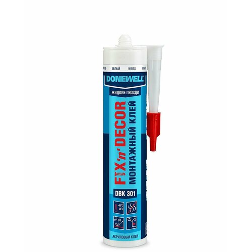 Монтажный клей Kudo разработан для приклеивания изделий из древесины, ДСП, ДВП, EPS, XPS и UPVC на бетонные, кирпичные, каменные, металлические, оштукатуренные и деревянные поверхности. Идеально подходит для сборки деревянных конструкций, приклеивания гипсокартона, OSB‐плит, декоративных элементов, подоконников, утеплителей различных видов.Преимущества:Устойчив к УФ излучению, воздействию чистящих и моющих средств.Отличная адгезия к бетону, кирпичу, камню, гипсокартону, дереву, ПВХ и другим строительным материалам.Обладает высокой прочностью и влагостойкостью.Химически нейтральный.Имеет широкий температурный диапазон эксплуатации: от –30°С до +70°С.Можно окрашивать водными и синтетическими красками.Цвет: Белый DBK 301Полное название: Клей монтажный "жидкие гвозди" DoneWell Fix-n-Decor на акриловой основе универсальный белыйОснова: АкриловыйНазначение: Клей монтажныйСезонность: ВсесезонныйОбъем: 260 млСостав: акриловая дисперсия, пластификатор, минеральные наполнители, функциональные добавки, пигменты.Хранение: Хранить в герметично закрытой оригинальной упаковке при температуре от +5°С до +25°С в сухом месте. Выдерживает 7 циклов замораживания-размораживания или однократное замораживание на 7 суток при температуре до –30°С. Размораживать при температуре +20±5°С.Срок годности: 24 месяца при соблюдении правил храненияПрименение:Работы рекомендуется проводить при температуре от +5°С до +25°С.Наносить на сухие, чистые и обезжиренные поверхности. Одно из оснований должно быть пористым. При нанесении на пористые материалы допускается небольшая влажность поверхности.Отрезать винтовую головку тубы над резьбой, навинтить наконечник, открутить колпачок и срезать носик под углом 45°, чтобы образовалось достаточное отверстие для дозирования.Для нанесения использовать строительный пистолет.Клей наносить полосами или точками с интервалом 10–20 см.Нанести клей на одну из поверхностей, склеиваемые поверхности совместить и плотно прижать друг к другу.В случае неправильной приклейки материал не отклеивать, а скорректировать его положение путём передвижения.Не оставлять картридж с клеем открытым более чем на 20 мин. Время сушки «на отлип» — 1 час; в течение 30 минут сохраняется подвижность; полная прочность достигается через 48 часов при температуре 23°C и относительной влажности воздуха 50%.Излишки незатвердевшего клея удалить влажной тканью. Инструменты очистить водой, руки — водой и мылом.Затвердевший клей удалить механическим способом.Внимание! Не использовать для швов, постоянно находящихся под водой. Не применять при температуре окружающей среды ниже +5°C и в условиях высокой влажности (>70%).