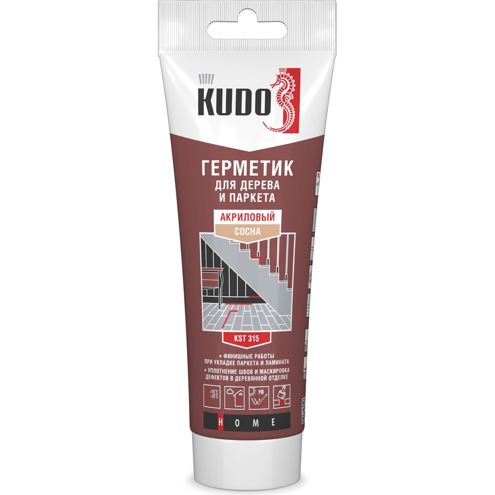 Подходит для работы с любыми деревянными материалами.Отличная адгезия к бетону, кирпичу, камню, гипсокартону, дереву, ПВХ и другим строительным материалам.Химически нейтральный, не вызывает коррозии.Высокая эластичность и деформационная подвижность.Имеет широкий температурный диапазон эксплуатации: от –60°С до +50°С.На 9,5 погонных метров при диаметре валика 5 мм.Высококачественный однокомпонентный акриловый пластоэластичный герметик KUDO® предназначен для герметизации и затирки стыков при укладке паркета, ламината и пробковых покрытий, заполнения щелей при монтаже плинтусов, наличников, деревянных оконных рам и подоконников. Применяется для уплотнения соединительных швов при отделке вагонкой и монтаже перегородок.Прекрасно подходит для устранения и маскировки дефектов на любой деревянной поверхности, где подвижность соединения не превышает 15%. Для внутренних работ.Обладает прекрасной адгезией к дереву, пробке, бетону, кирпичу, камню, гипсокартону. Паропроницаемый, стоек к плесени и грибку, не меняет цвет с течением времени. Не трескается и не крошится, отлично подходит для швов с деформацией. Химически нейтральный. Не содержит растворителей, отверждается за счёт испарения воды. Без запаха. Легко наносится и очищается, не оставляет пятен на дереве и торцах ламината. После полного отверждения можно шлифовать, окрашивать водными и синтетическими красками.ПрименениеРаботы рекомендуется проводить при температуре от +5°C до +35°C, включая температуру основания. Температура герметика +20°C…25°C.Герметик наносить на чистые, сухие и обезжиренные поверхности.Разгладить его в шве шпателем, смоченным мыльным раствором.Для очистки инструмента использовать воду, при необходимости — с добавлением чистящих средств. Излишки незатвердевшего герметика удалить при помощи влажной ткани или механическим способом.Время высыхания слоя герметика толщиной 2 мм — 48 часов (при температуре +23°C и относительной влажности 50%).Для окраски герметика рекомендуется использовать краски и лаки, эластичность плёнки которых сопоставима с эластичностью герметика. При окрашивании цветного герметика лаками необходимо учитывать, что при этом цвет герметика изменится, станет более насыщенным.