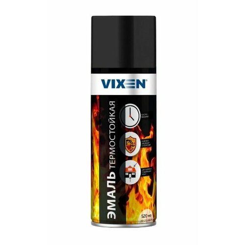 Термостойкая эмаль VIXEN черная, аэрозоль, 520 мл VX53002 - термостойкая антикоррозийная кремнийорганическая эмаль. Придает металлическим поверхностям надежную защиту от коррозии, в том числе при воздействии растворов солей, минеральных масел и нефтепродуктов.Отличается превосходным сцеплением с окрашиваемой поверхностью, поэтому не требует предварительного грунтования перед ее нанесением.Обладает двойным укрывом, благодаря чему экономична в использовании.Высокие атмосферостойкие качества эмали позволяют использовать ее для изделий, эксплуатирующихся в экстремальных условиях.Не стекает при равномерном нанесении. Легко наносится на труднодоступные места и изделия со сложной геометрией поверхности.Может использоваться для внутренних работ, покрытие не токсично после высыхания.Эмаль каждого цвета обладает определенной термостойкостью:Черный + 750 °СПредназначена для защитного окрашивания металлических поверхностей, которые эксплуатируются в условиях повышенной влажности и высоких температур (компонентов выхлопной системы автомобилей, паропроводов с перегретым паром, нефте- и газопроводов, деталей водонагревательного, котельного, печного и прочего оборудования).Применяется для наружных и внутренних работ.