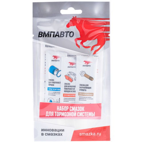Набор смазок для тормозной системы включает в себя 3 типа смазок: для поверхности поршня, для направляющих суппорта, для нерабочих сторон колодок. Комплексное обслуживание тормозной системы.