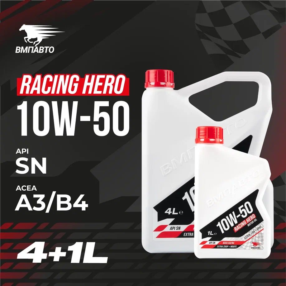 Лидер на треке!Спортивное масло VMPAUTO Racing Hero 10w-50 для форсированных высоконагруженных двигателей с возможностью эксплуатации в городе и на треке. Три кита надежности спортивного моторного масла: Спортивный пакет присадок, разработанный ВМПАВТО обеспечивает непревзойденную защиту двигателя от износа благодаря увеличенному содержанию противоизносных (ZDDP) и антифрикционных компонентов (MODTC). Крепкий полимер увеличивает срок службы масла, сохраняя его вязкость даже в самых экстремальных условиях. Синтетическая основа, состоящая из VHVI-базы, эстеров и алкилированных нафталинов, делает масло термостабильным, надежным и доступным. Все три компонента поддерживают оптимальные условия работы форсированного двигателя.Преимущества:- Высокая защита двигателя от износа;- Отличные низкотемпературные свойства, обеспечивающие уверенный пуск;- Устойчивость к старению и образованию отложений;- Низкий угар благодаря наличию алкилированных нафталинов(AN);- Совместимо с новейшими системами нейтрализации выхлопных газов;- Совместимо с маслами других производителей с аналогичными допусками.ТЕХНИЧЕСКИЕ ХАРАКТЕРИСТИКИ:Класс вязкости согласно SAE: 10W-50;Плотность при 15°C: 0,870 г/см?;Вязкость при 40°C: 100,0 мм?/с;Вязкость при 100°C: 18 мм?/с;Вязкость при -25 °C (CCS): 6500 мПа*с;Индекс вязкости: 199;Температура застывания: -39 °C;Испаряемость NOACK: 10,0;Температура вспышки: 235 °C;Зольность сульфатная: 1,5 %;Щелочное число: 11,0;Пенообразование 24/94/24 °С, не более: 5/30/10 мл;Испытание на стенде Bosch, потеря вязкости не более: 5,0 %