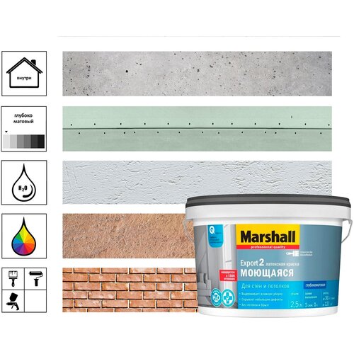 Marshall Export-2 - глубокоматовая краска на водной основе, обеспечивающая безупречно гладкое покрытие, устойчивое к влаге и износу.ПреимуществаБыстрое высыхание за два-четыре часа.Отсутствие резкого запаха.Нанесение без брызг и потеков кисточкой, валиком или распылителем.Отличная укрывистость.Маскировка небольших изъянов основания.Область примененияКраска Marshall Export-2 предназначена для окрашивания стен и потолков внутри помещений. Благодаря экологичному составу подходит для использования в детских и оздоровительных учреждениях.Бренд Marshall принадлежит концерну AkzoNobel, ведущему мировому производителю лакокрасочной продукции. Компания имеет представительства более чем в 150 странах, штаб-квартира находится в Нидерландах.