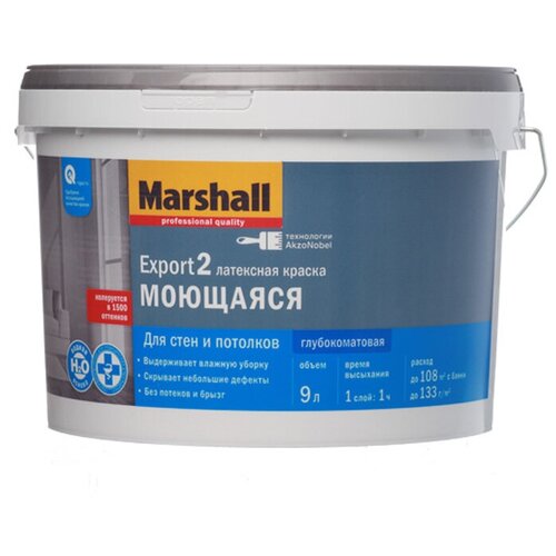 ип товара: Краска; Бренд: Marshall; Вид: Водно-дисперсионный, Латексный; Применение: Для стен, Для потолка; Вес/объем, кг/л: 9; Покрытие: Гладкая; Влагостойкость: Да; Тип поверхности: Обои, Бетон, Гипсокартон, Штукатурка; Тип помещения: Жилые помещения/офисы, Школы/детские сады/медицинские учреждения; Тип работ: Внутренние; Устойчивость к мытью: Да; Цвет основы: Белый; Желаемый тон: Светлый/ Белый; Основа для колеровки: Да; Колеровка обязательна: Нет; Страна-производитель: Россия; Расход: 10-12 м2/л; Вес, кг: 13,71Водно-дисперсионная краска для стен и потолков. Предназначена для отделки стен и потолков в жилых и офисных помещениях с умеренной влажностью. Применяется для окраски минеральных поверхностей (бетон, штукатурка, кирпич и т. п.), гипсокартона, обоев под покраску. Сертифицирована для применения в детских и лечебно – профилактических учреждениях. Устойчива к мытью без применения моющих средствдисперсия акрилового сополимера, диоксид титана, наполнители, функциональные добавки, Краска водно-дисперсионная интерьерная Marshall Export 2 белая основа BW 9 л