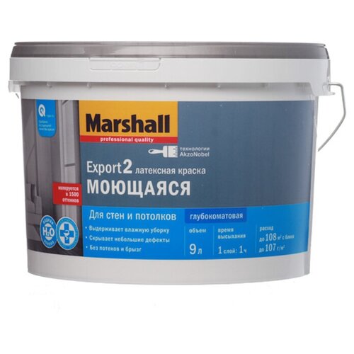 ип товара: Краска; Бренд: Marshall; Вид: Латексный, Водно-дисперсионный; Применение: Для стен, Для потолка; Вес/объем, кг/л: 9; Покрытие: Гладкая; Влагостойкость: Да; Тип поверхности: Штукатурка, Обои, Гипсокартон, Бетон; Тип помещения: Школы/детские сады/медицинские учреждения, Жилые помещения/офисы; Тип работ: Внутренние; Устойчивость к мытью: Да; Цвет основы: Прозрачный; Желаемый тон: Темный/ Насыщенный; Основа для колеровки: Да; Колеровка обязательна: Да; Страна-производитель: Россия; Расход: 10-12 м2/л; Вес, кг: 12,01Водно-дисперсионная прозрачная краска-основа для стен и потолков. Предназначена для отделки стен и потолков в жилых и офисных помещениях с умеренной влажностью. Применяется для окраски минеральных поверхностей (бетон, штукатурка, кирпич и т. п.), гипсокартона, обоев под покраску. Сертифицирована для применения в детских и лечебно – профилактических учреждениях. Устойчива к мытью без применения моющих средств. дисперсия акрилового сополимера, диоксид титана, наполнителКраска водно-дисперсионная интерьерная Marshall Export 2 основа BC 9 л
