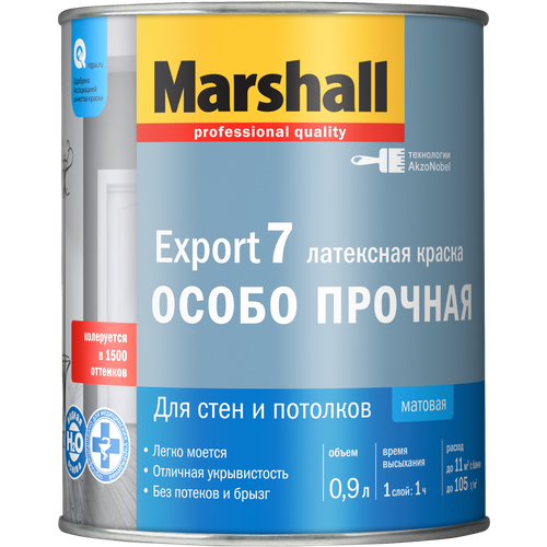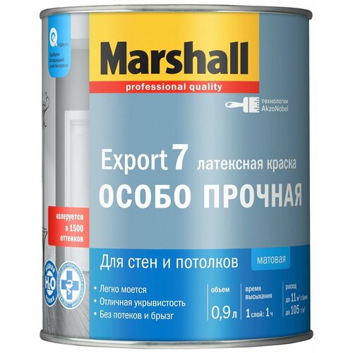 Базовая краска Export 7 торговой марки Marshall предназначена для внутренних работ и наносится на стены или потолок. Такая краска хорошо подчеркивает фактурность стен, поэтому может наноситься на декоративную штукатурку или обои, предназначенные для покраски. Водно-дисперсионное покрытие отличается высокими декоративными свойствами и обладает хорошей адгезией.Особая формула позволяет аккуратно наносить краску без брызг и подтеков, кроме того, она быстро высыхает. В качестве инструмента нанесения можно использовать кисть или валик. Поверхности с такой краской можно мыть при помощи щадящих моющих средств. Перед нанесением краска разводится водой в соответствии с инструкцией.