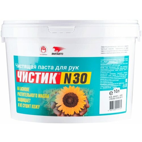 Средство для очистки рук ВМПАВТО Чистик № 30, ведро, 10 л 6813 предназначено для эффективного очищения кожи рук от сильных загрязнений: дизельная отработка, въевшиеся смазки, битумные пятна и др.Выполнена на основе растительных масел с древесной мукой, это делает пасту более однородной и не позволяет разваливаться при нанесении и растирании.Защищает и не сушит кожу. Не раздражает ссадины и порезы.Достаточно нанести небольшое количество очищающей пасты на руки, растереть и смыть водой.Может применяться также для удаления загрязнений с поверхности пластика, кафеля и дерева.