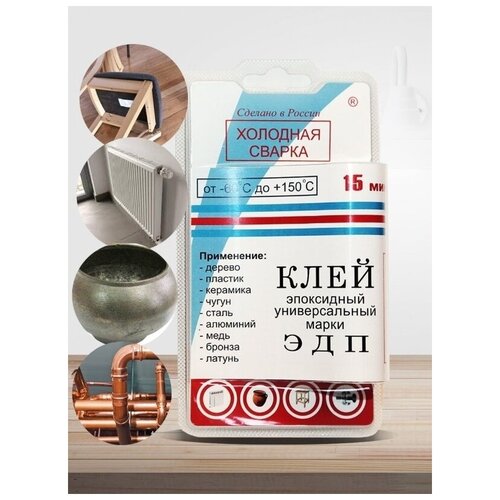 Предназначен для быстрого и надежного склеивания, ремонта и герметизации соединений, а также для восстановления утраченных фрагментов изделий из черных и цветных металлов, пластмасс, керамики, дерева.Состав: эпоксидная смола, пластификатор, отвердитель.Время высыхания между 2 слоями: 1 час.Время полного высыхания: 24 часа.Объем: 0,057 кг.Температура при нанесении: от -60 до + 150 0С.Страна-производитель: Россия.