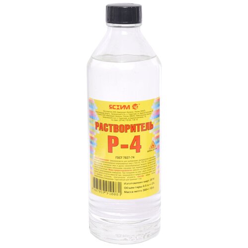 Ясхим Р 4 растворитель. Фасовка: 500 мл стекло. Стандарт: ГОСТназначение: Ясхим используется для разбавления лакокрасочных материалов на основе поливинилхлоридных хлорированных смол ПСХ ЛС и ПСХ ЛН, сополимеров винилхлорида, эпоксидных смол и других пленкообразующих веществ (за исключением эмали ХВ-124 серой и защитной).Свойства: При разбавлении лакокрасочных материалов растворитель позволяет добиться необходимых качественных характеристик получаемых из них покрытий.
