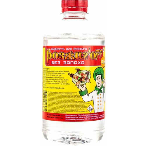 Предназначен для розжига древесного угля, дров, брикетов и другого твердого топлива. С его помощью вы без особых усилий сможете затопить камин, разжечь костер и мангал. Жидкость «Розжиг'off» отличается максимально длительным временем горения. Тщательно пропитанное таким средством твердое топливо разгорается равномерно, без резкого вспыхивания. «Розжиг'off» полностью выгорает, не влияет на вкус пищи, приготовленной на гриле, мангале или барбекю. При неукоснительном соблюдении инструкции по применению розжиг абсолютно безопасен для здоровья.