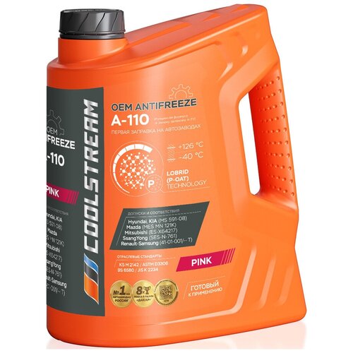 Охлаждающая жидкость CoolStream A-110 5 кг CS-010502-PN – фосфатный лобридный антифриз, использующийся для первичной заправки на заводах по производству автомобилей Hyundai и KIA. Обладает улучшенной формулой, благодаря чему отличается высокой стабильностью эксплуатационных свойств. Эффективно работает в широком диапазоне температур – от -40 до +126ºС.Соответствует требованиям: Mazda, Mitsubishi, Renault-Samsung, SsangYong, ASTM D3306, BS 6580, JIS K2234, KS M 2142.