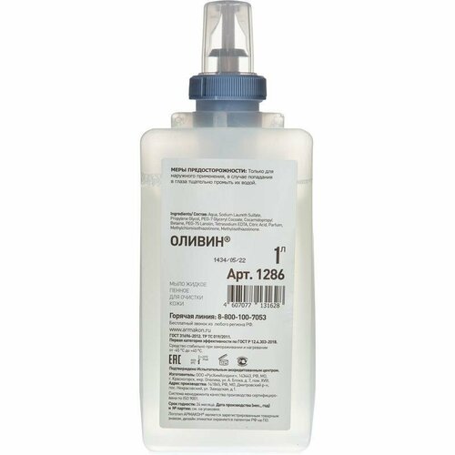Мыло жидкое пенное Оливин. Объем: 1 л. Предназначено для очищения кожи от вредных производственных загрязнений и защитных кремов. Дозируется в виде пены через специальный дозатор. Не содержит абразивов, силиконов, растворителей, щелочей, красителей. Средс...
