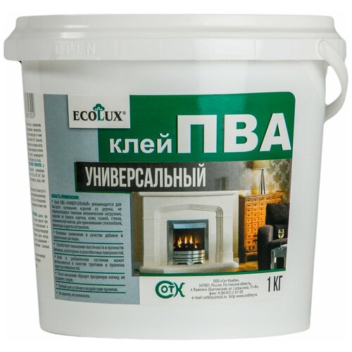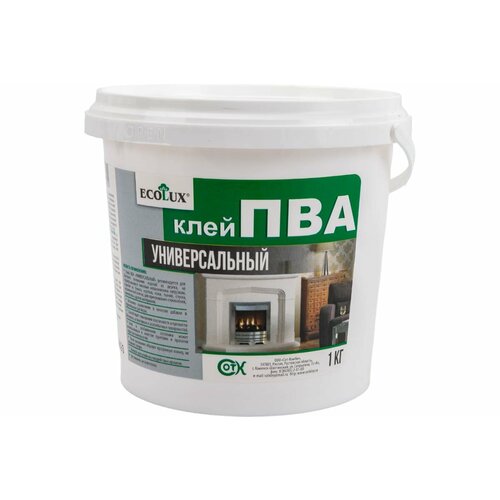Клей ПВА ECOLUX универсальный 1 кг (комплект из 4 шт)Клей ПВА Ecolux универсальный предназначен для бытовых нужд, для быстрого склеивания изделий из дерева, не подвергающихся тяжелым механическим нагрузкам, изделий из бумаги, картона, кожи, тканей, стекла, керамической плитки, для приклеивания стеклообоев, линолеума и других материаловВозможно применение в качестве добавки в строительные растворыСпособствует повышению эластичности и прочности бетонных, штукатурных и шпаклёвочных поверхностейКлей в разбавленном состоянии может использоваться в качестве грунтовки и пропитки пористых поверхностейПосле высыхания образует прозрачную пленку, не оставляет следовКлеевой шов устойчив к воздействию времени-Вес: 1042 г.-Фасовка: 1 шт-Тип индивидуальной упаковки: Без упаковки-Длина упаковки: 13.5-Высота упаковки: 12-Ширина упаковки: 13.5-Объем упаковки: 2.187-Объем продукта: 2.214-Объем бокса: 26.568-Материал: См. на упаковке-Вес, кг/Объём, л: 1-Назначение клея: Универсальный-Температурное ограничение: Нет-Запрет реализации по сегментам: 00000000516