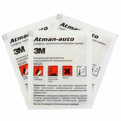 Салфетки с активатором адгезии используются для повышения адгезии (силы приклеивания) материалов с низкой поверхностной энергией. Такими материалами являются общеизвестные пластики, используемые при производстве автомобильных деталей экстерьера и элементов интерьера (ТРО, РРО, РР, РС, РС+АВС и т.п.). При эксплуатации автомобиля мельчайшие поры на поверхности лакокрасочного покрытия и деталей из полимеров (пластиков), забиваются частичками смол, пыли и автохимии. Поэтому, при попытке приклеить что-нибудь на такую поверхность, не всегда удается, а обезжиривание устраняет далеко не весь спектр загрязнений. Активаторы адгезии (праймеры 3M) специально разработаны для применения с двусторонними клейкими лентами 3M.Инструкция по нанесению:Праймер следует наносить только на области соприкосновения с двусторонним скотчем и не следует обрабатывать поверхности вне зоны установки наклеиваемой детали. Необходимо очистить поверхность и деталь от грязи, влаги и пыли. Обезжирить поверхность этиловым спиртом. Области соприкосновения с клеевым слоем обработать салфеткой пропитанной активатором адгезии. Наилучший результат достигается при обработке поверхности в "один проход". Монтаж производить после высыхания праймера, не менее чем через 1 минуту после обработки. Диапазон рабочей температуры для нанесения активатора адгезии 3М от 15 до 30˚С. Внимание! Праймер очень быстро выветривается. С момента открытия упаковки у вас есть буквально несколько минут, чтобы нанести его на поверхность.