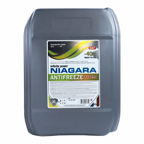 Жидкость охлаждающая "Антифриз" "Ниагара Type-D 40" (желтый) 20 кгАнтифриз «NIAGARA® TYPE-D» Профессиональная охлаждающая низкозамерзающая жидкость на основе этиленгликоля, специально подготовленной воды и органических ингибиторов коррозии. Не содержит нитритов, аминов, фосфатов, боратов и силикатов. Рекомендован для эксплуатации в системах охлаждения ДВС автомобилей: RENAULT-NISSAN и ПАО «автоваз».Цвет жидкости может варьироваться от желтого до желто-зеленого (это норма). Цвет НЕ является определяющим характеристики фактором!Разработана в полном соответствии с требованиями:RENAULT STANDARD 41-01-001/--T,PSA B71 5110,автоваз ТТМ 1.97.0717-2000,автоваз ТТМ 1.97.0731-99,ASTM D 3306, ASTM D 4985,SAE J 1034.преимущества: Длительный срок эксплуатации - до 250 000* км; Обеспечивает требуемый уровень отвода тепла от ДВС; Подходит для использования в ДВС из алюминия и чугуна; Нейтральна к полимерам, резинам и эластомерам; Не образует накипи и отложений**; Обладает улучшенными свойствами теплопередачи; Полностью совместима и заменяет антифриз «RENAULT GLACEOL RX TYPE D»; Эффективно защищает от коррозии алюминиевые, медные, латунные, стальные и чугунные элементы систем охлаждения. Нейтрален к припоям; Соответствует ASTM D2570; Обладает отличными моющими и нейтрализующими свойствами; Отлично подходит для эксплуатации в RENAULT DUSTER, RENAULT MEGANE, RENAULT SANDERO, RENAULT LOGAN I, II, NISSAN TERRANO, CITROEN C3, CITROEN C4, CITROEN C5, CITROEN BERLINGO, PEUGEOT 2008, PEUGEOT 3008, PEUGEOT 5008, PEUGEOT 408, PEUGEOT PARTNER, для автомобилей автоваз с двигателями автоваз и RENAULT, для автомобилей DACIA.*- при условии содержания системы охлаждения ДВС и ее агрегатов в исправном состоянии. **- при соблюдении требований по поддержанию уровня жидкости в системе, при соблюдении регламента замены жидкости и недопущении смешивания со сторонними охлаждающими жидкостями, при содержании системы охлаждения ДВС и ее агрегатов в исправном состоянии.внимание: Антифриз допускается эксплуатировать в ДВС легковой, легкой коммерческой и коммерческой автомобильной технике, других производителей, в том числе PEUGEOT и CITROEN, предписывающих использование охлаждающих жидкостей, соответствующих требованиям: RENAULT STANDARD 41-01-001/--T, ASTM D 3306, ASTM D 4985, SAE J 1034.смешиваемость. Лучшие результаты работы Антифриза «NIAGARA TYPE-D» достигаются при полной замене антифриза. Допускается смешивание и кратковременная эксплуатация антифриза «NIAGARA TYPE-D» с другими органическими антифризами, соответствующими требованиям стандартов RENAULT STANDARD 41-01-001/--T, ASTM D 3306, ASTM D 4985, SAE J 1035