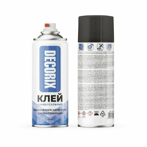 Аэрозольный клей DECORIX® предназначен для склеивания поролонов, текстиля, пластиков, виниловых деталей между собой или приклеивания их на деревянные и металлические поверхности. Подходит для приклеивания обивки салона автомобиля и звукопоглощающих покрытий. Обладает эластичностью, образует прочное быстросохнущее клеевое соединение. Клей равномерно распыляется и удобен для нанесения на большие по площади поверхности. Идеален для случаев, когда требуется быстрое высыхание. Наносится равномерным ровным слоем благодаря распылителю.подготовка поверхности И применениеРабочая температура склеивания от +10°С до +30°С.1. Поверхность очистить, обезжирить и просушить.2. Перед началом работ баллон тщательно взболтать в течение 1 минуты.3. Нанести клей с расстояния 15–20 см на обе поверхности и плотно прижать друг к другу на 1–2 минуты.4. После окончания работ очистить распылитель – перевернуть баллон и нажать на распылитель до появления чистого газа.меры предосторожностиБаллон под давлением! Не распылять вблизи открытого огня и раскаленных предметов!Огнеопасно! Во время работы запрещается курить! Не вскрывать и не сжигать баллонпосле использования! При работе применять средства индивидуальной защиты кожи рук(перчатки), органов дыхания (респиратор) и глаз (очки). Аэрозольные пары не вдыхать иизбегать попадания клея на кожу и в глаза. Работать в проветриваемом помещении! Неразбирать и не давать детям! Не употреблять внутрь!