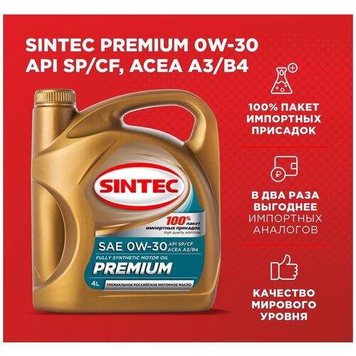 ![]() | 3541 ₽ | 24.10.2024 Моторное масло SINTEC PREMIUM 9000 SAE 0W-30, API SP/CF, ACEA A3/B4 Синтетическое 4 л | |