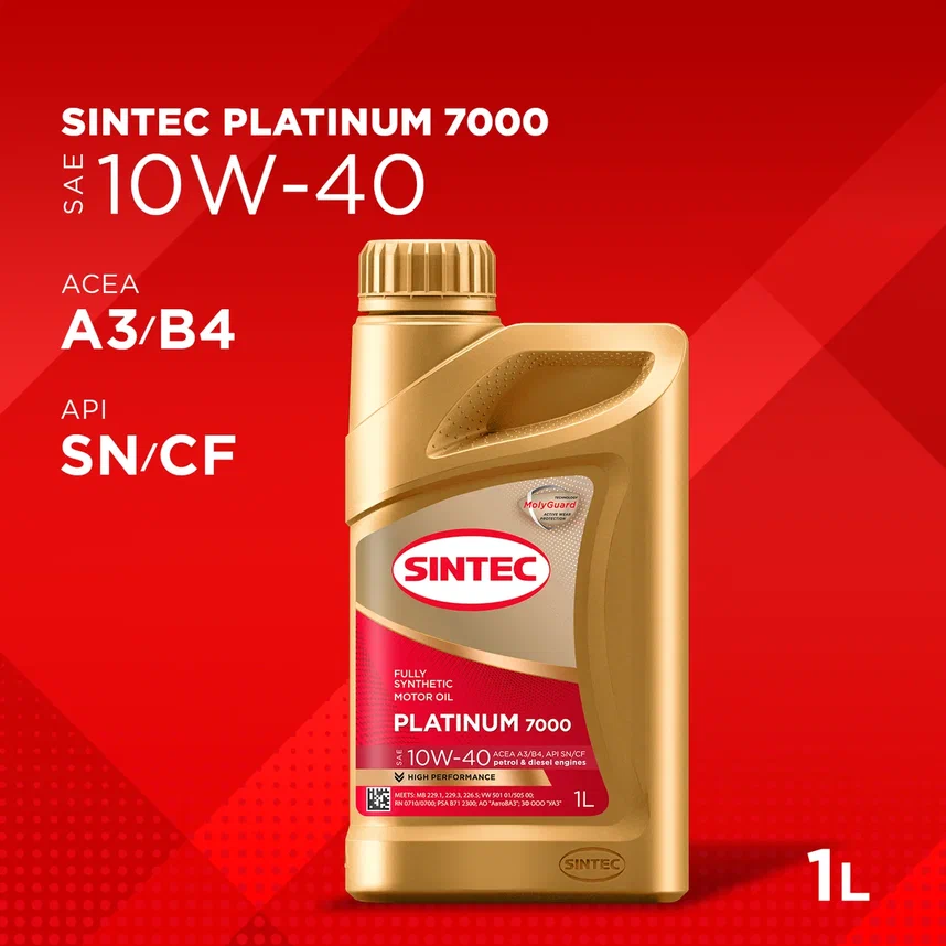 Синтетическое моторное масло Sintec Platinum 7000 SAE 10W-40 с фирменной технологией Molyguard. Разработано для применения в бензиновых и дизельных двигателях, где рекомендовано использование масел класса 10W-40 и ACEA A3/B4. Предназначено для легковых автомобилей, легких внедорожников, микроавтобусов и легких грузовых автомобилей. Сохраняет чистоту, предотвращает образование отложений, коррозии и ржавчины. Высокие показатели вязкости обеспечивают надежную защиту и стабильную работу двигателя даже при экстремальных нагрузках — специальная формула эффективно снижает трение, значительно продлевая срок службы. Адаптируется к тяжелым условиям эксплуатации и различным стилям вождения.