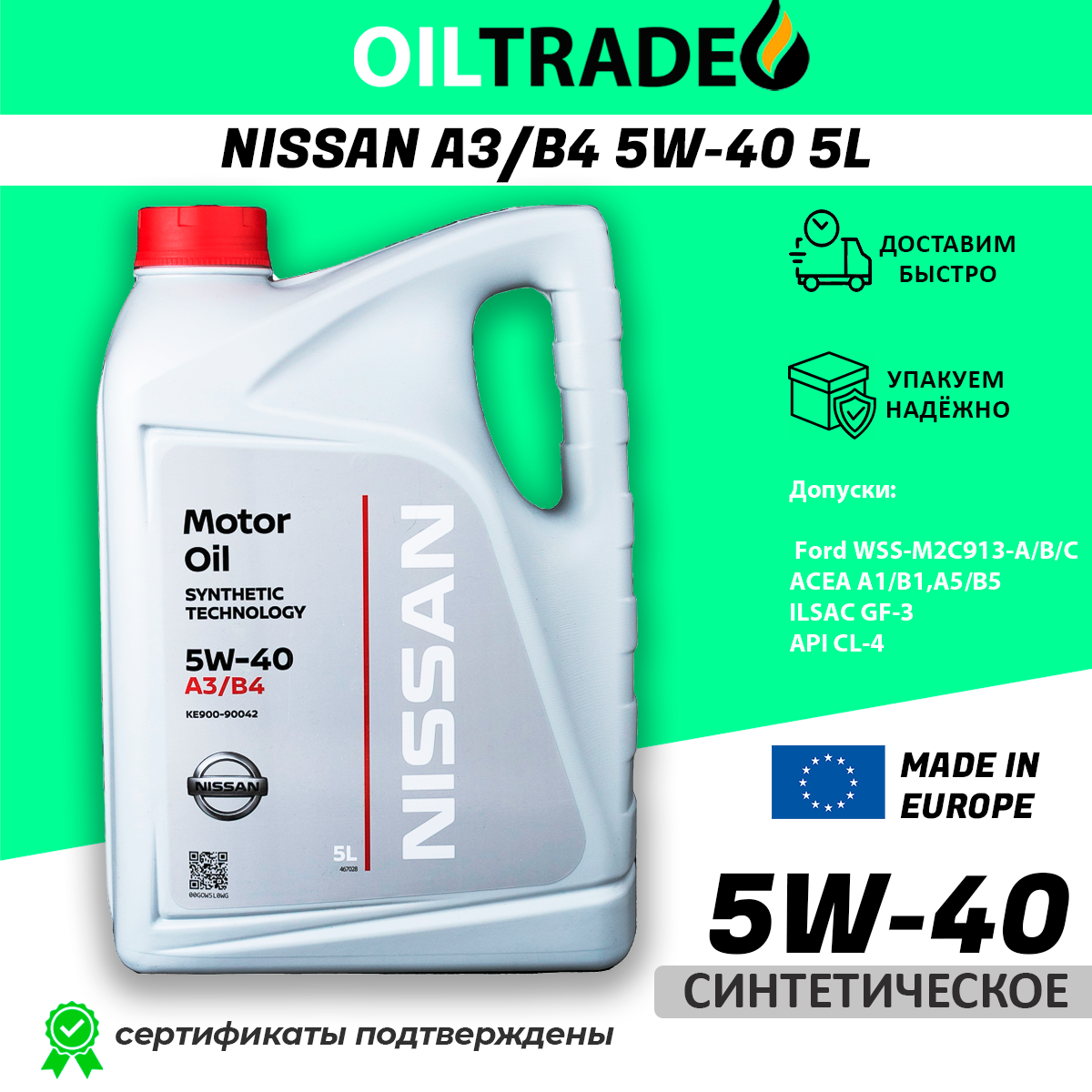 Оригинальное синтетическое моторное масло Ниссан 5w40 A3/B4 предназначено для использования в дизельных и бензиновых двигателях, включая модификацию с турбинами. Масло Nissan 5w-40 является всесезонным материалом, может использоваться при температурах от –35°C до +40°C. При низких температурах имеет высокий коэффициент текучести, поэтому быстрее поступает к трущимся деталям и уменьшает трение при холодном запуске, повышая моторесурс и топливную экономичность.Масляная основа обладает отличным противо-окисилительным свойством и предотвращает отложения на внутренних элементах двигателя, повышая срок эксплуатации без потери свойств масла Nissan 5в40. Nissan масло моторное обладает специальной основой, которая позволяет повысить адгезию к металлу. Поэтому масло Ниссан 5w 40 дольше остается на стенках двигателя, продлевая срок его службы.Mоторное масло Ниссан подходит для любых условий эксплуатации и особенно пригодно в тяжелых условиях. Моторные масла 5 W40 полностью адаптированы для всех стилей вождения. Оригинальное масло Ниссан 5w40 5 литров высокого качества разработано специально для автомобилей японского концерна Nissan — проверить подлинность можно с помощью кода, который указан на оборотной стороне канистры под специальным стикером с защитным покрытием.Имеет допуски: ACEA A3/B3/B4; API SN/CF; EC; SM/CF; Nissan; Renault RN0700; Renault RN0710; Porsche A40; GM-LL-B-025; PSA B71 2296.